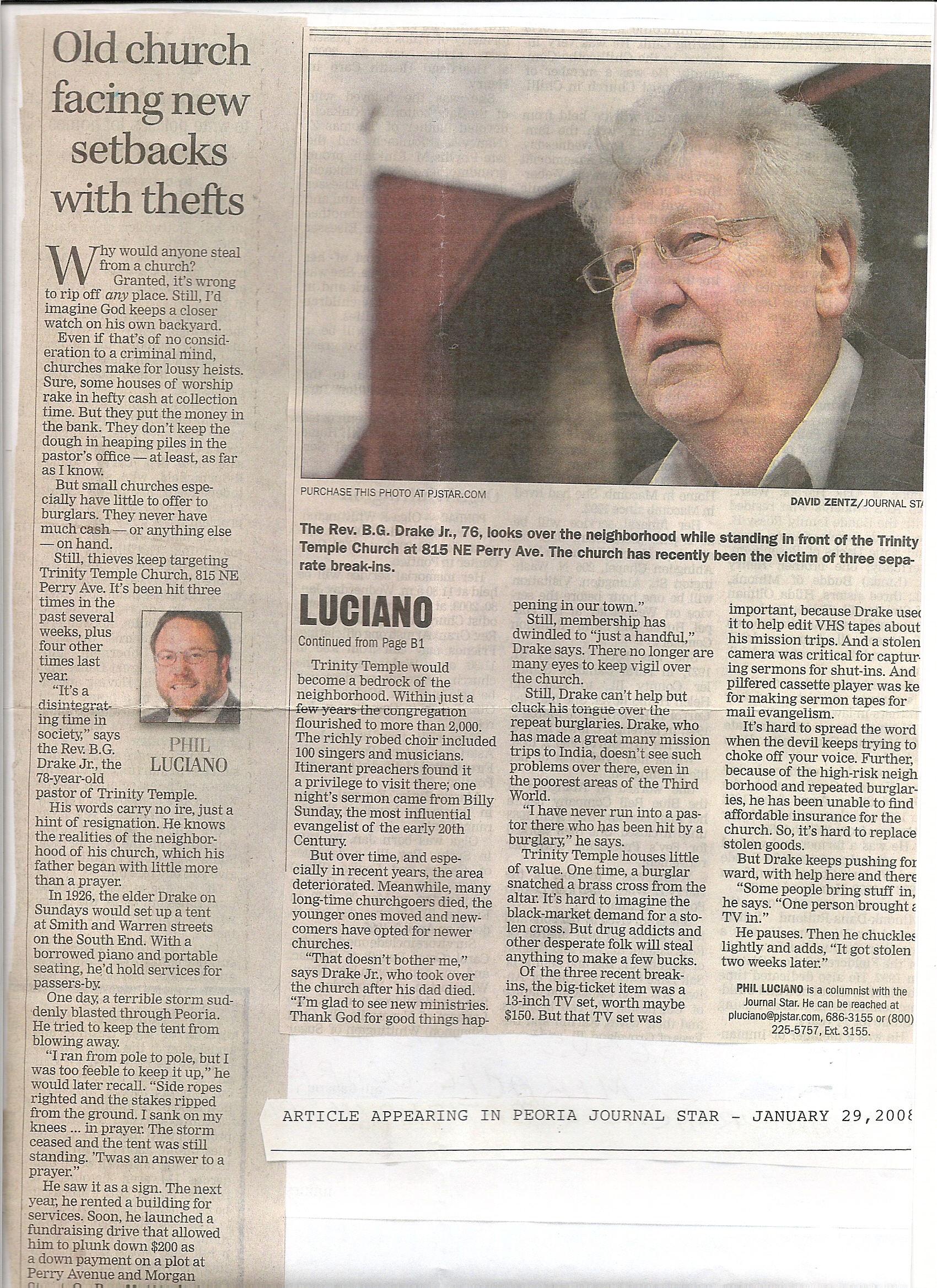 Dr. B. G. Drake has been my pastor since the early 80's. I met him while doing radio on WVEL in central Illinois. Dr Drake opened the doors to India for me and I have been ministering in that nation ever since. He is the pastor of the oldest Pentecostal work in Peoria, IL and many of the well known preachers of the past have graced His pulpit. The work was started by his father and as a young evangelist, Pastor B. G. traveled throughout India, seeing souls saved, the lame walk, blinded eyes opened, the deaf could hear. He has so many wonderful testimonies that he could share for days. I give honor to him for standing with me as my pastor down through the years. May God Bless Him and Keep Him for many more Years.