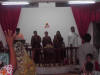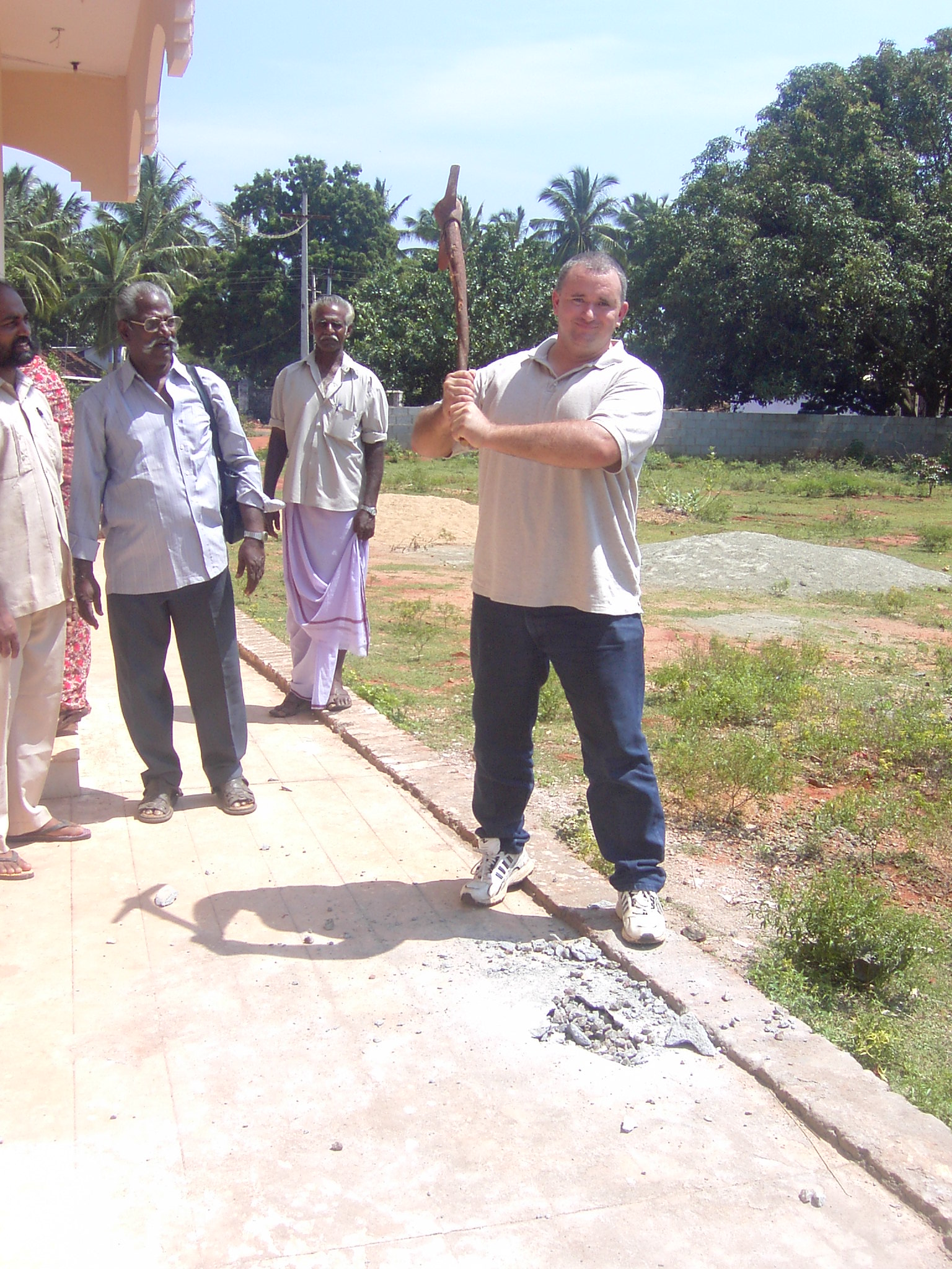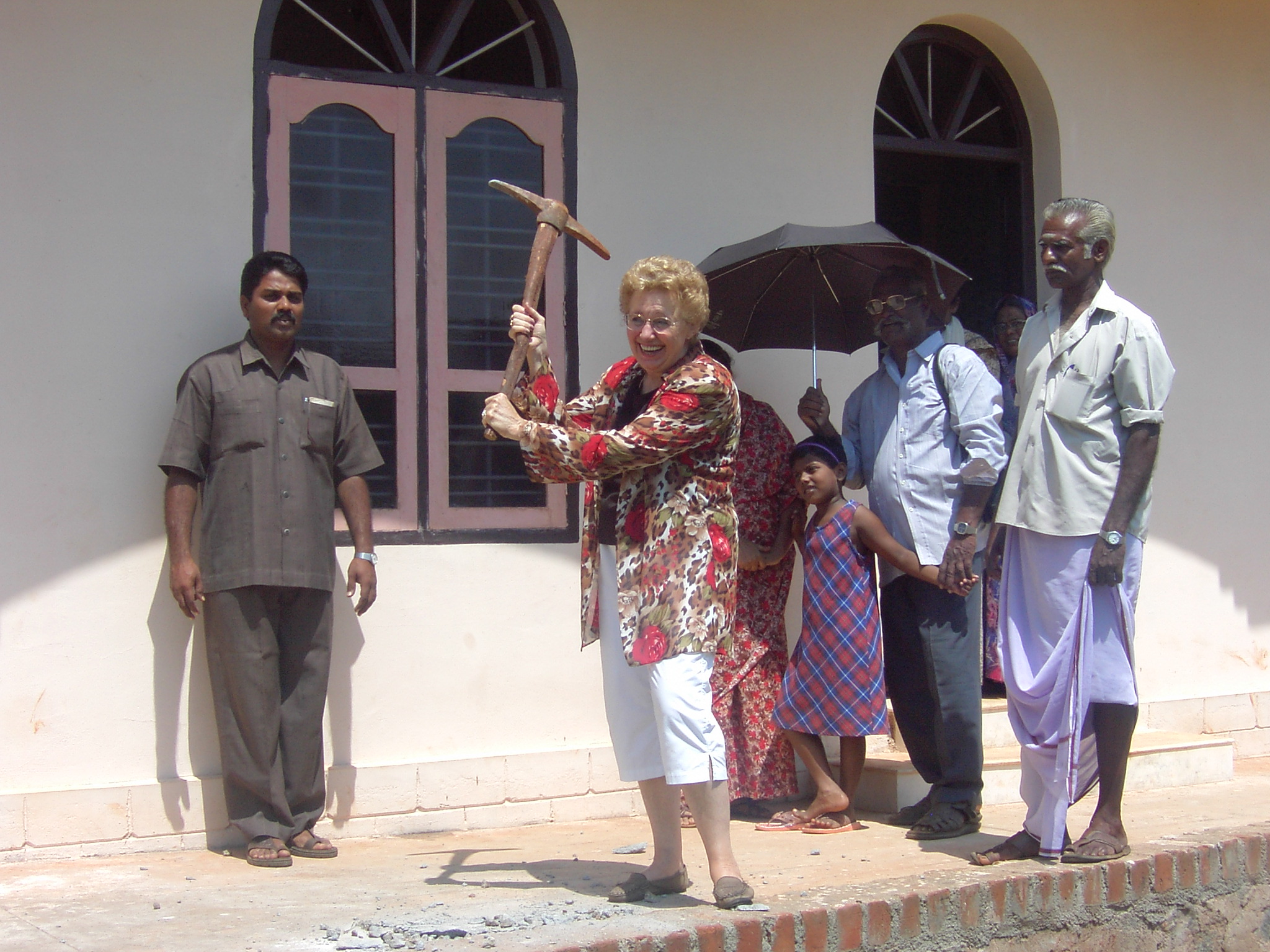 Pastor Shirley lifts the pick at the groundbreaking for the new well.